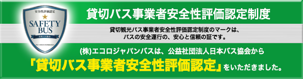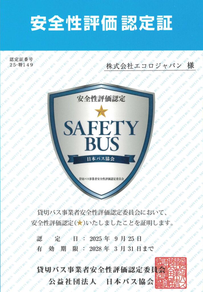 株式会社エコロジャパンバスは、公益社団法人日本バス協会の「貸切バス事業者安全性評価認定制度」の評価認定委員会で安全輸送に対する取り組みが優良と認められ、2025年9月25日に「貸切バス事業者安全性評価認定」をいただきました。